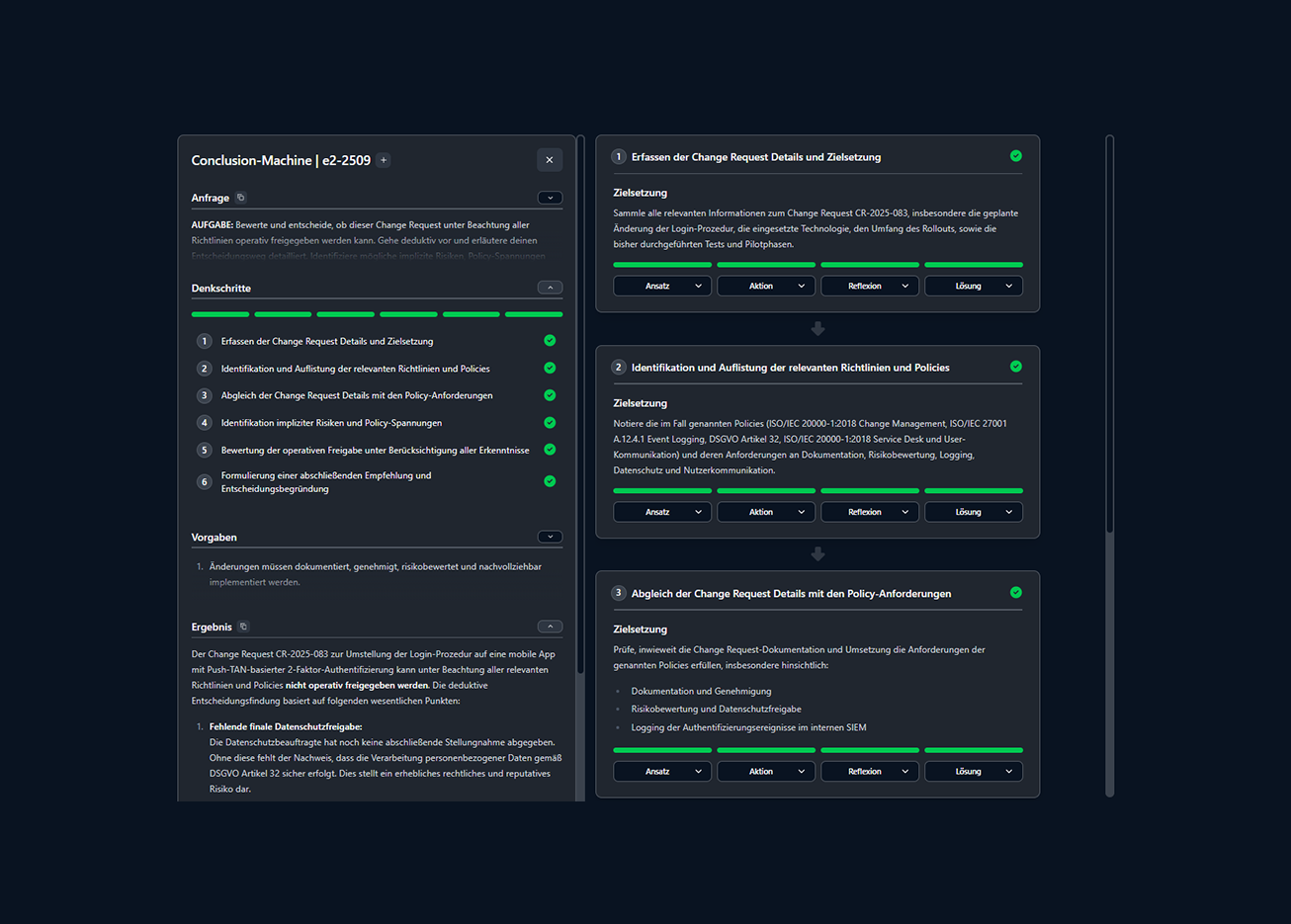 Conclusion Machines bieten Ihnen einen logischen und strukturierten Ansatz. Sie können aus allgemeinen Regeln gesicherte Schlussfolgerungen ziehen, Halluzinationen reduzieren und Probleme gezielt lösen.