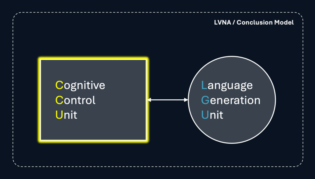 Highly abstracted, LVNA consists of two central functional blocks: a Language Generator and a Functional Control Unit. Together, they form the architecturally anchored cognitive core of CCMs.