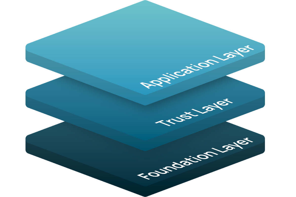 The trust layer of the stack includes an enterprise-grade authorization concept that allows the objects created in the foundation layer to be managed and assigned accordingly. Logging, compliance gateways, and our conclusion machines are also located there as basic components.